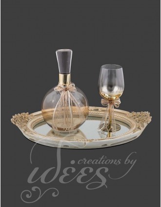 Περιλαμβάνει δίσκο καθρέπτη με λουλουδάκια στα χεράκια, κανάτα, και ποτήρι κρασιού.