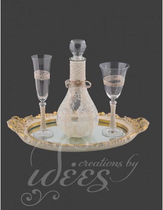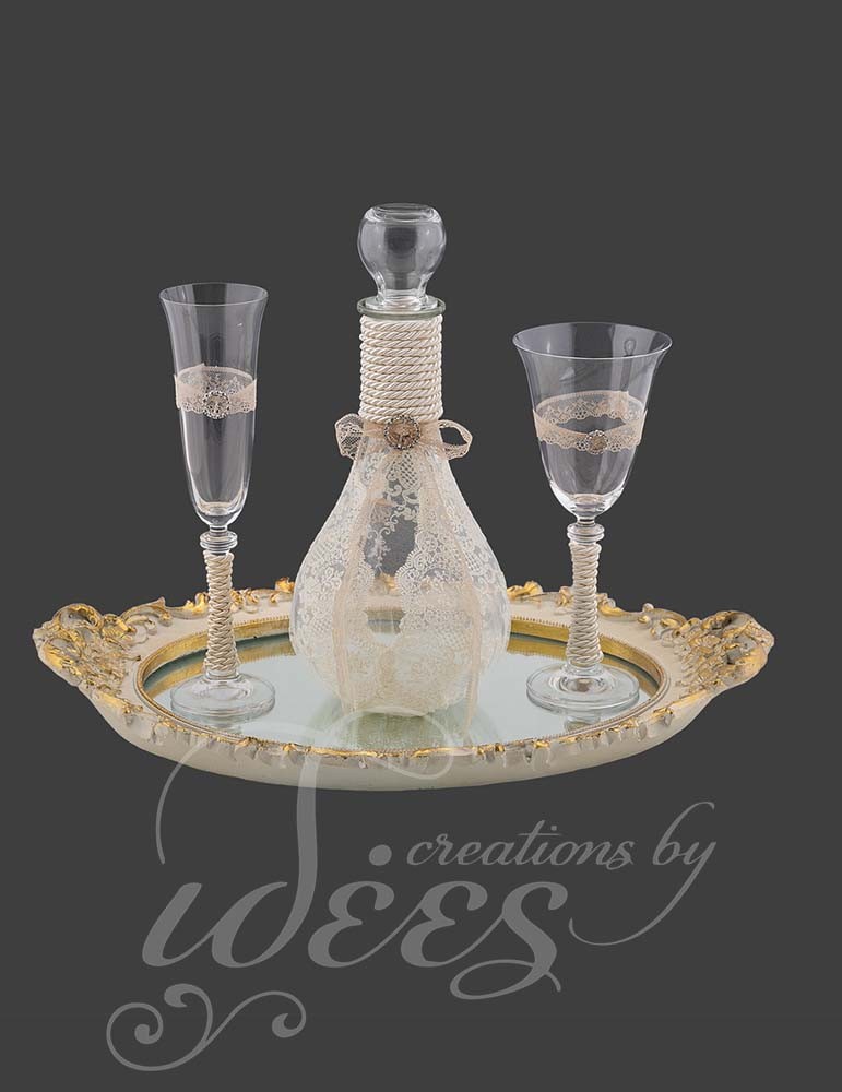 Περιλαμβάνει ξύλινο δίσκο σκαλιστό με καθρέπτη, κανάτα στολισμένη με κορδέλες και δαντέλα και με τον ίδιο στολισμό τα ποτήρια.