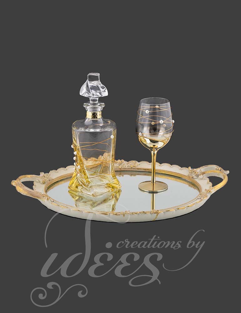 Περιλαμβάνει δίσκο σκαλιστό με καθρέπτη, κανάτα με πέρλες και ποτήρι με ίδια διακόσμηση.