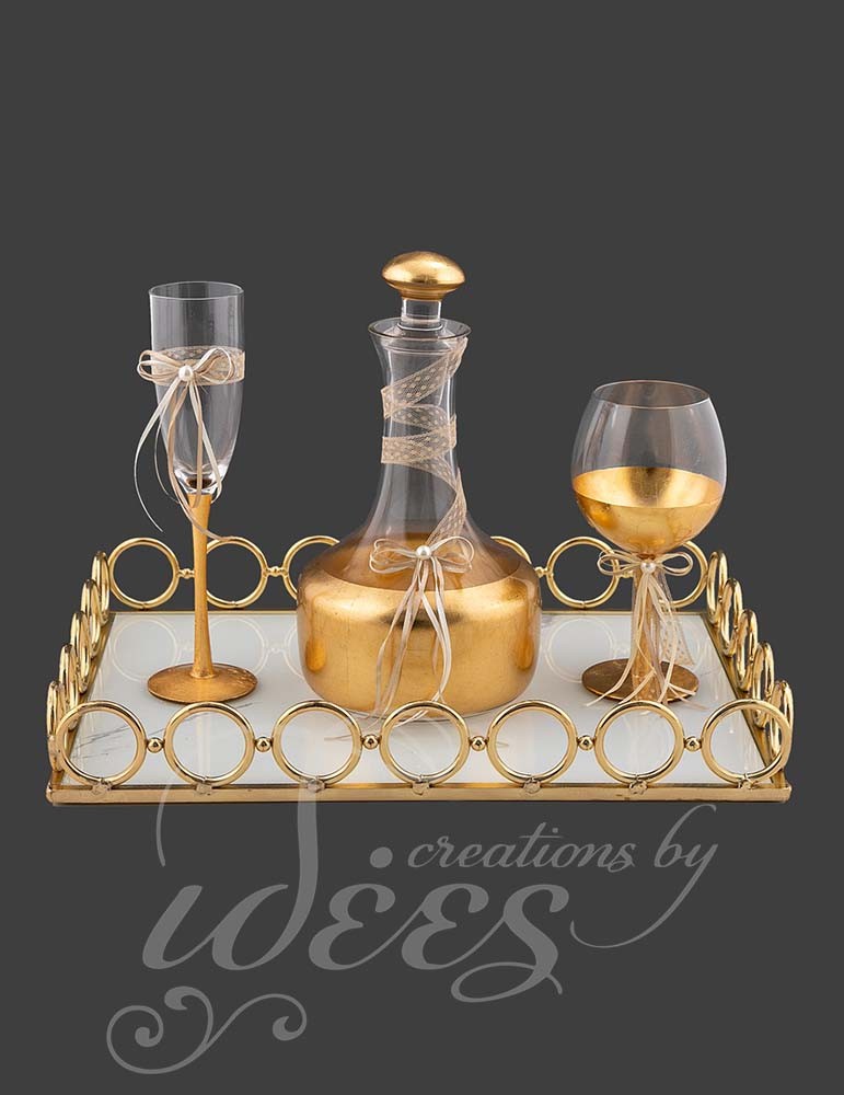 Περιλαμβάνει επίχρυσο δίσκο, κανάτα με χρυσή λεπτομέρεια, ποτήρια σαμπάνιας και ποτήρι κρασιού.