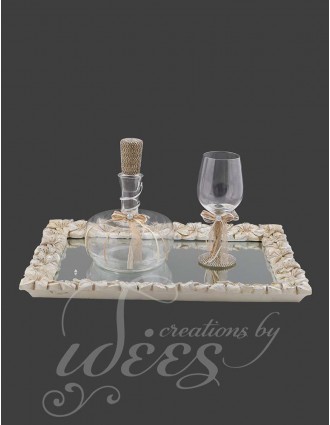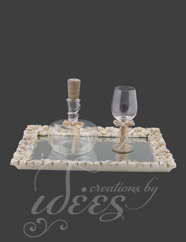 Περιλαμβάνει δίσκο με καθρέπτη και σκαλιστά λουλούδια γύρω-γύρω, κανάτα με στρας στο καπάκι και ποτήρι κρασιού με στρας στο ποδαράκι.