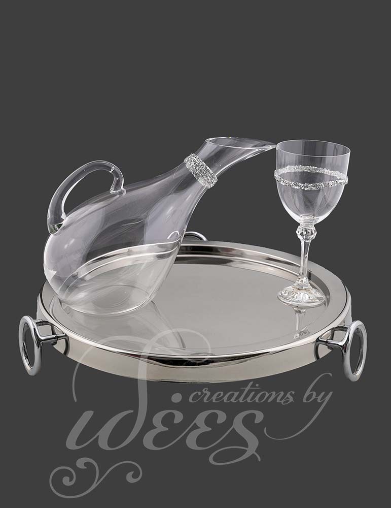 Περιλαμβάνει μοντέρνο δίσκο επάργυρο, κανάτα στολισμένη πλαγιαστή με στρας και ποτήρι κρασιού με στρας.