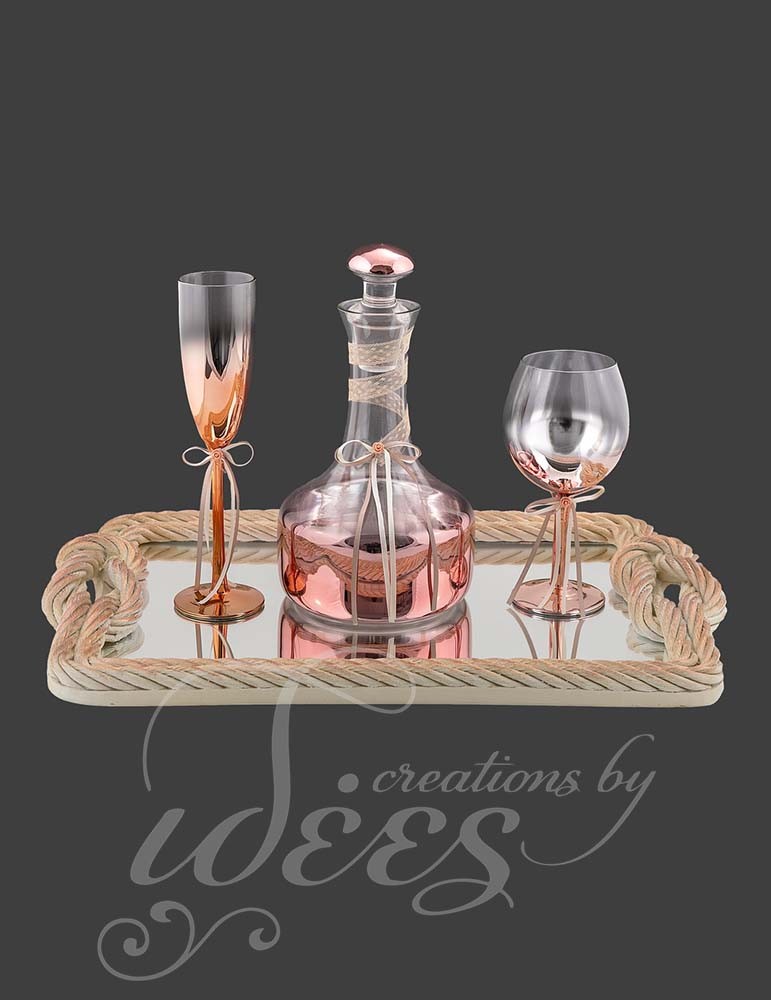Περιλαμβάνει δίσκο με υφή σχοινιού με καθρέπτη, κανάτα, ποτήρια σαμπάνιας και ποτήρι κρασιού στις αποχρώσεις του ροζ χρυσό στολισμένα με κορδέλες και λουλουδάκι.