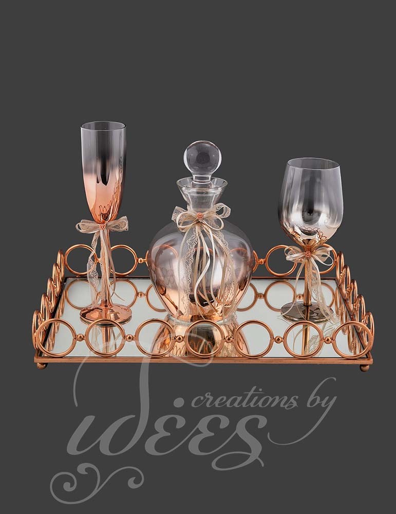 Περιλαμβάνει δίσκο επάργυρο σε ροζ χρυσό με καθρέπτη, κανάτα, ποτήρια σαμπάνιας και ποτήρι κρασιού στις αποχρώσεις του ροζ χρυσό στολισμένα με κορδέλες και λουλουδάκι.