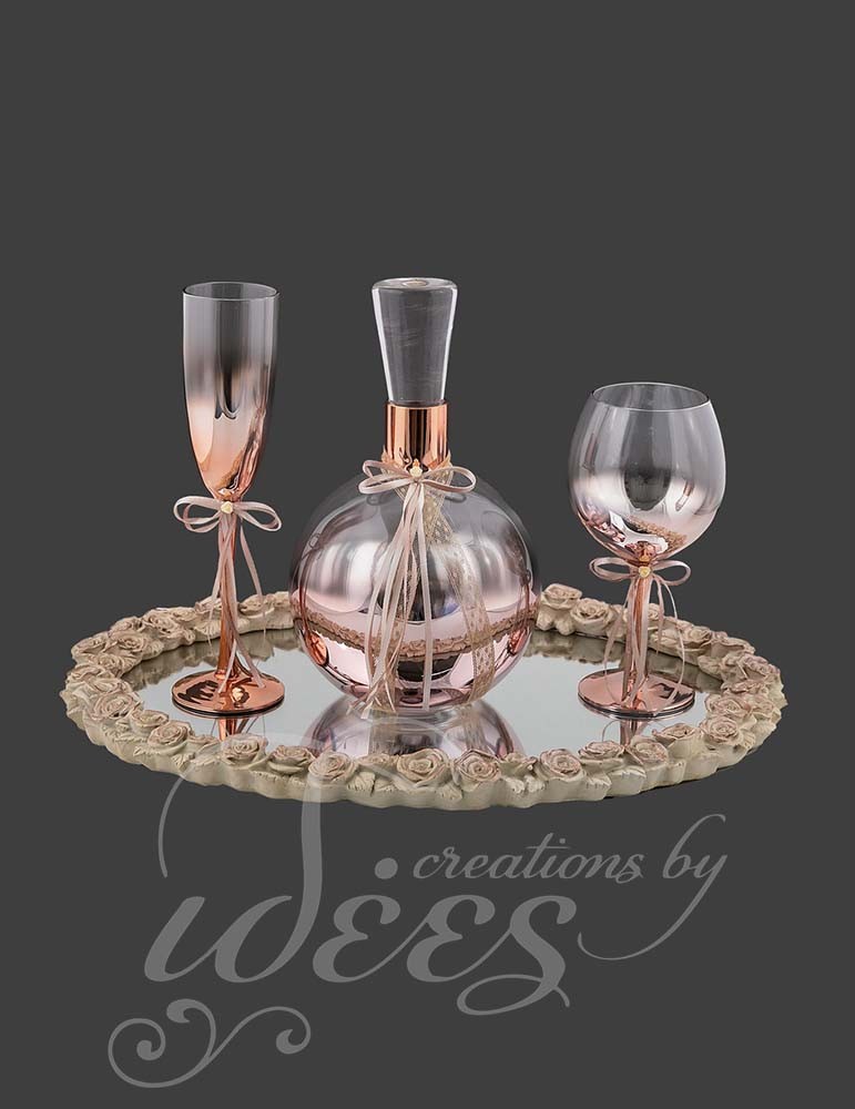 Περιλαμβάνει ξύλινο δίσκο με πατίνες σε ροζ χρυσό με καθρέπτη, κανάτα, ποτήρια σαμπάνιας και ποτήρι κρασιού στολισμένα με κορδέλες και λουλουδάκι.