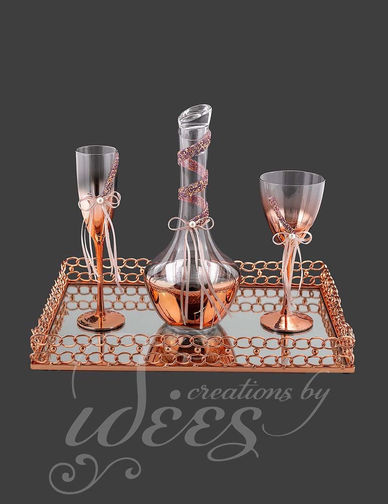 Περιλαμβάνει δίσκο σε ροζ χρυσό με καθρέπτη, κανάτα, ποτήρια σαμπάνιας και ποτήρι κρασιού στολισμένα με στρας, κορδέλες και πέρλα.