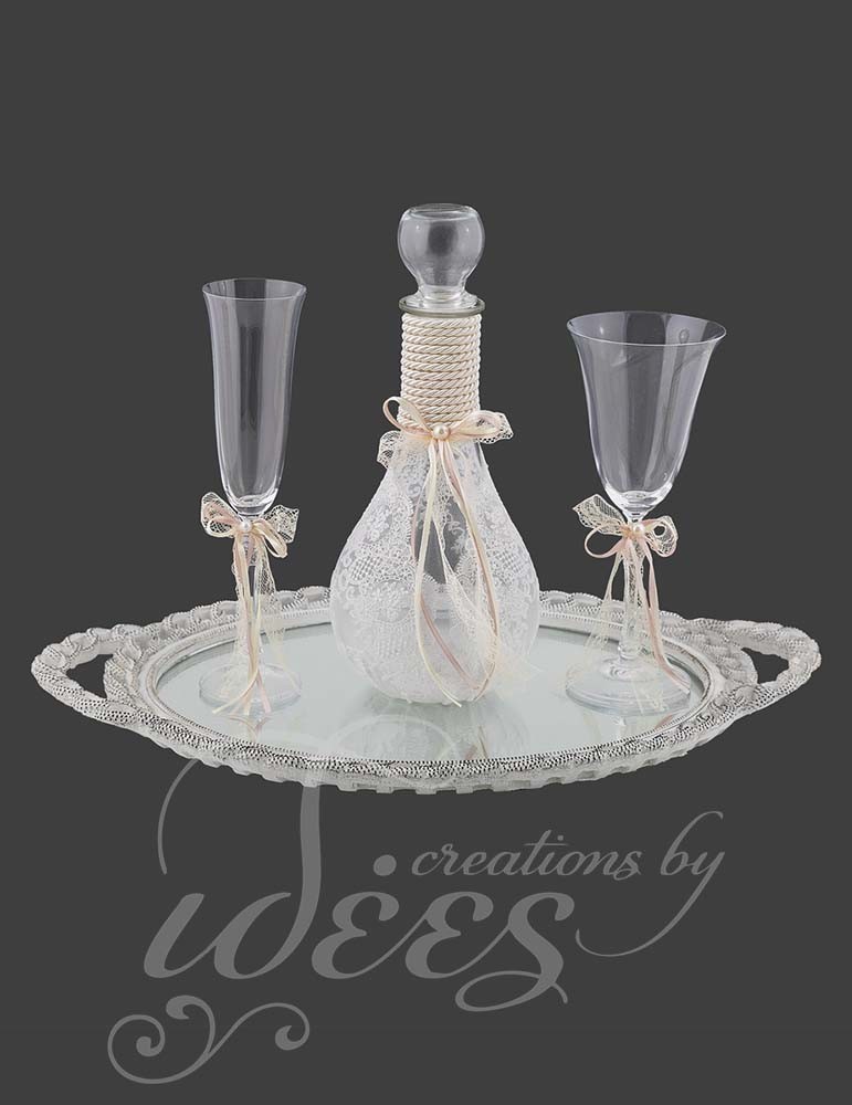 Περιλαμβάνει δίσκο με καθρέπτη, κανάτα διακοσμημένη με δαντέλα και κορδόνι, ποτήρια σαμπάνιας και ποτήρι κρασιού με κορδέλες και πέρλα.
