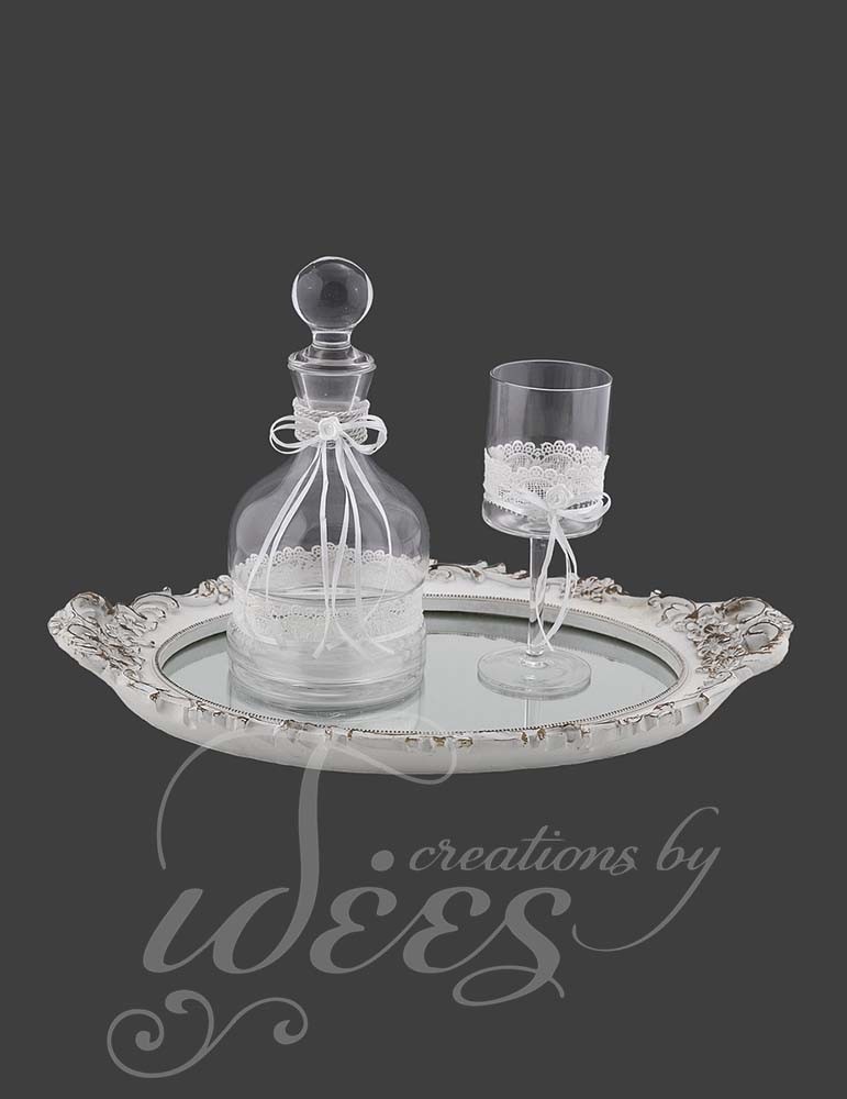 Περιλαμβάνει δίσκο με καθρέπτη, κανάτα διακοσμημένη με δαντέλα και ποτήρι κρασιού με δαντέλα και λουλουδάκι.
