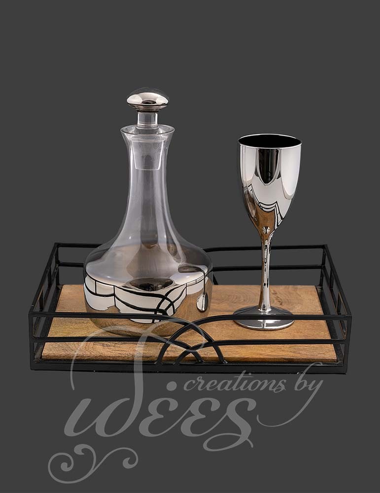 Περιλαμβάνει μεταλλικό δίσκο με ξύλινη βάση, κανάτα και ποτήρι κρασιού σε ασημί απόχρωση.