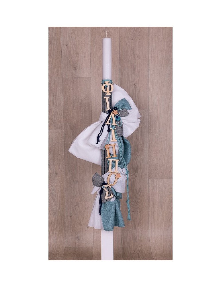 Λαμπάδα με υφάσματα και το όνομα του παιδιού με ξύλινα στοιχεία.