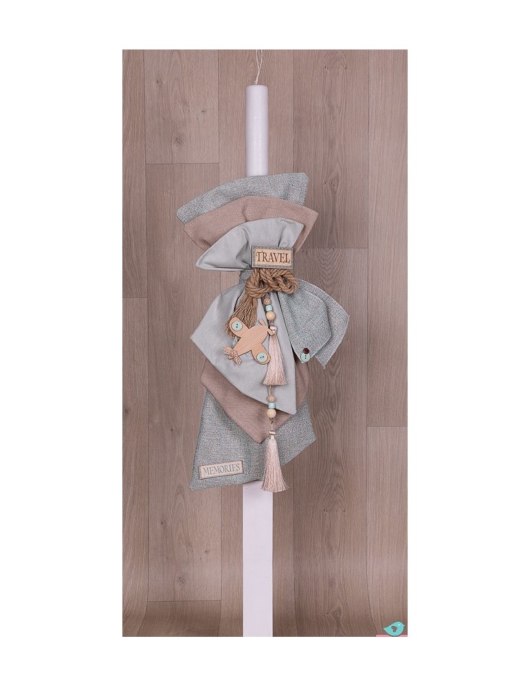 Λαμπάδα βάπτισης με υφάσματα σε βεραμάν αποχρώσεις και θέμα το αεροπλανάκι.