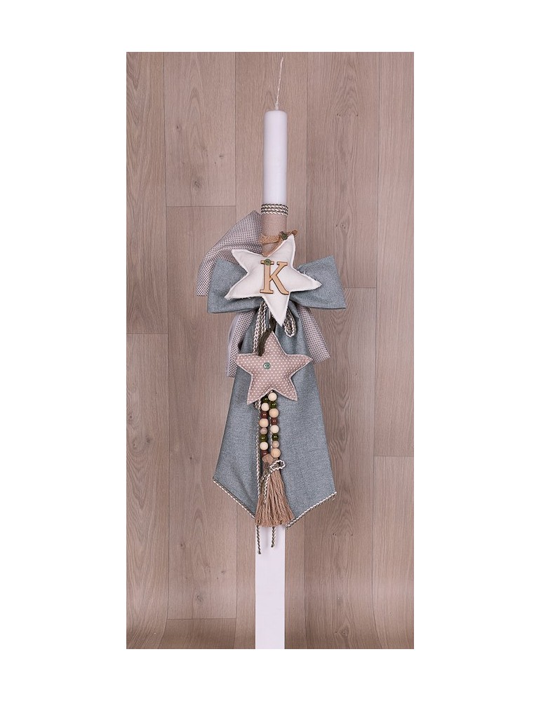 Λαμπάδα με υφάσματα και το όνομα του παιδιού με ξύλινα στοιχεία.