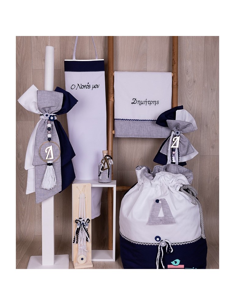 Σετ βάπτισης με ξύλινο μονόγραμμα και αερόστατο. Τα υφάσματα έχουν τριχρωμία και στο ξύλινο παγκάκι υπάρχει μαξιλάρι σε βεραμάν απόχρωση και το όνομα του παιδιού. Το σετ περιλαμβάνει λαμπάδα, κουτί, λαδόπανα και λαδικά.