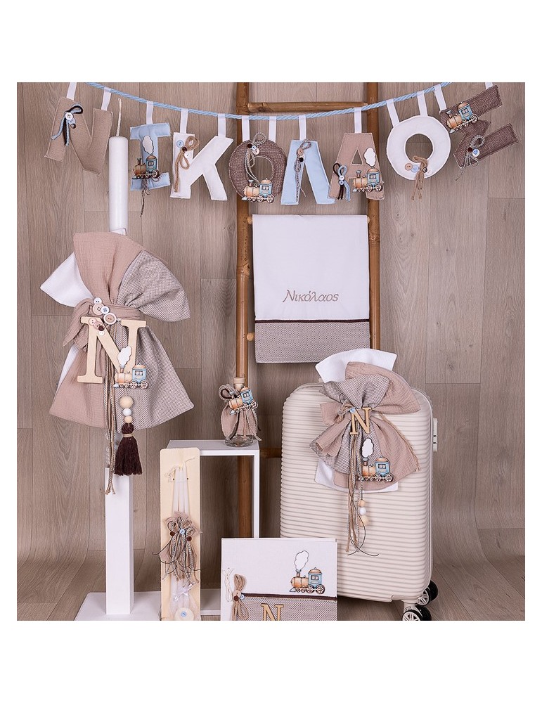 Βαπτιστικό σετ σε τόνους του μπεζ με ξύλινο μονόγραμμα και θέμα το τραίνο.