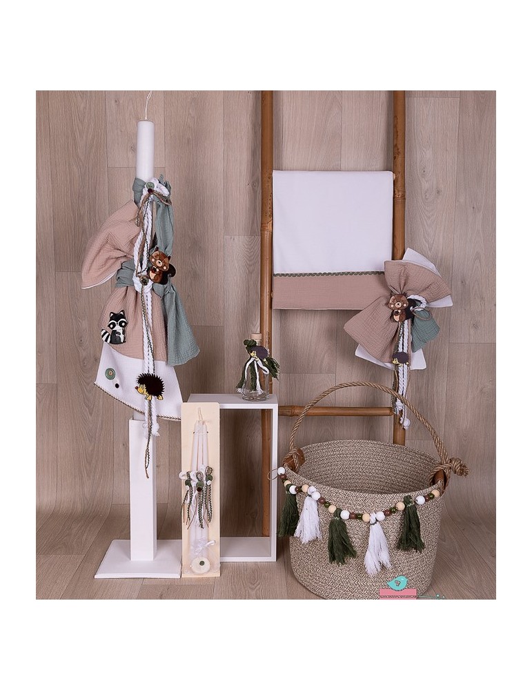 Σετ βάπτισης με θέμα τα ζωάκια του δάσους και χρώματα σε μπεζ, κίτρινο και λαδί. Το σετ περιλαμβάνει λαμπάδα, κουτί, λαδόπανα και λαδικά.