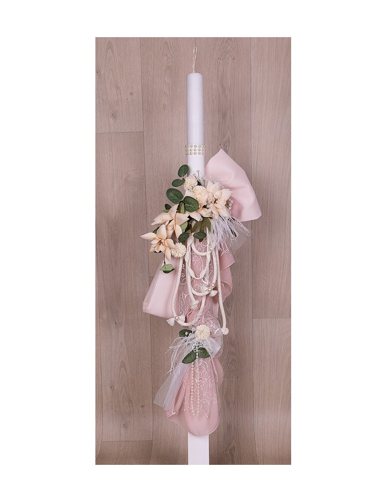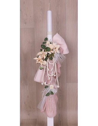 Λαμπάδα βάπτισης με μαλακό τούλι σε επίπεδα και υφασμάτινα λουλούδια.