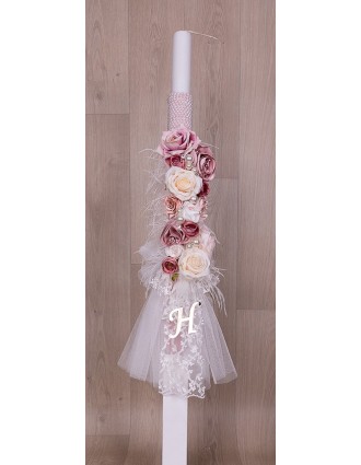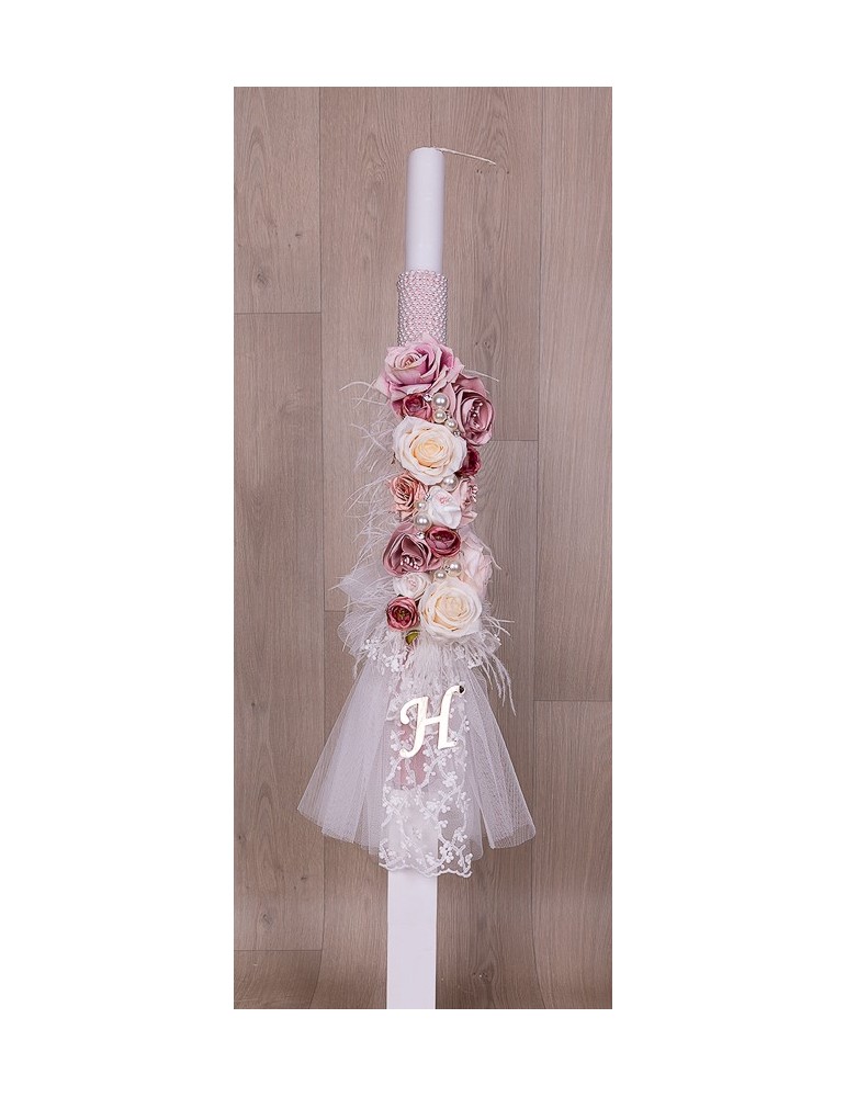 Λαμπάδα βάπτισης με λουλούδια και πέρλες και μονόγραμμα.
