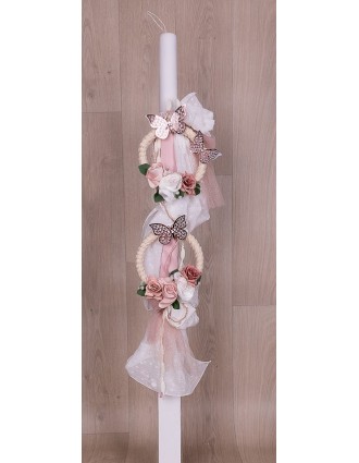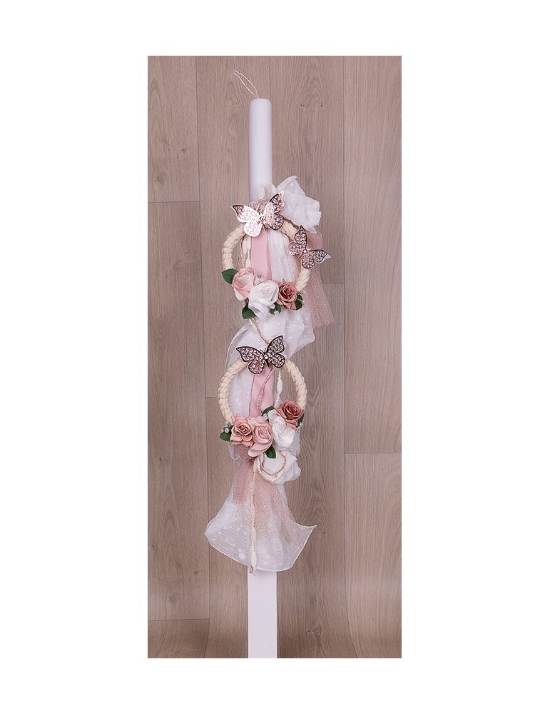 Λαμπάδα βάπτισης με κύκλους από κορδόνι στολισμένα με λουλούδια και πεταλούδες.