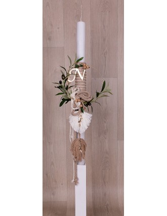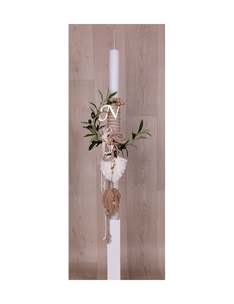Λαμπάδα βάπτισης με χρυσό κύκλο στολισμένο με κλαδί ελιάς και boho στοιχεία.