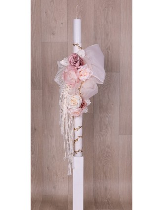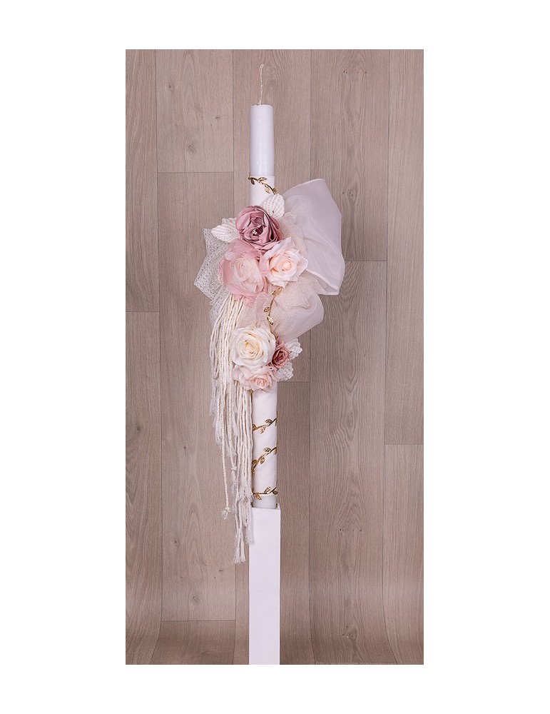 Λαμπάδα βάπτισης με λουλούδια και στολισμένη με υφάσματα και κορδόνια.