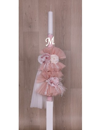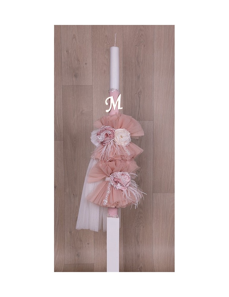Λαμπάδα με μαλακό τούλι διακοσμημένο με χειροποίητα λουλούδια και μονόγραμμα.