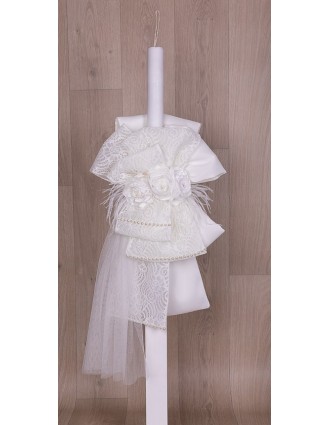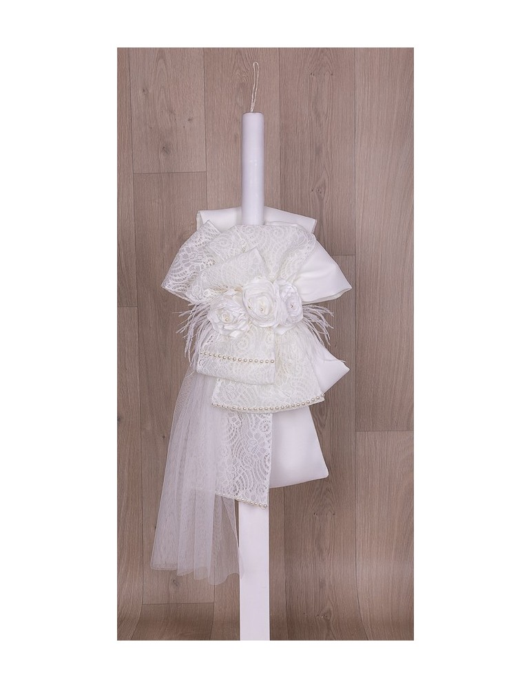 Λαμπάδα σε λευκό χρώμα με υφάσματα λουλούδια και δαντέλα.
