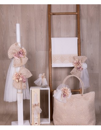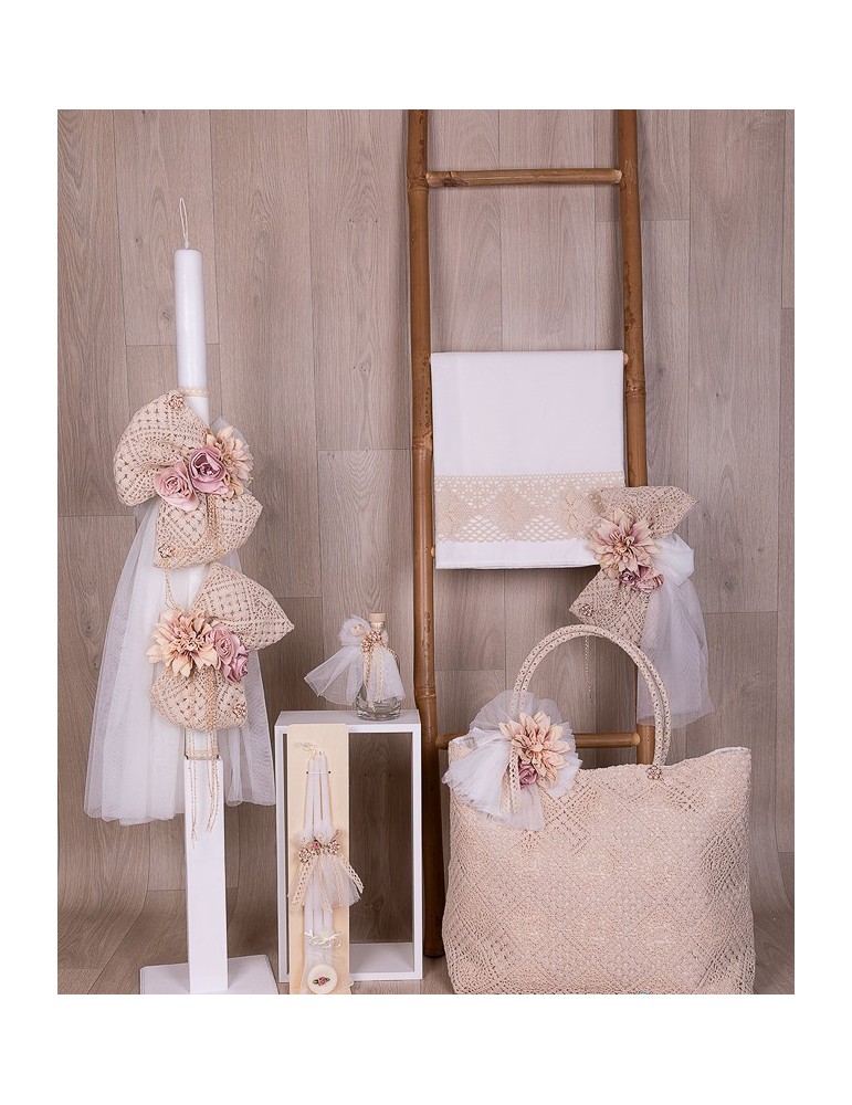 Σετ βάπτισης με λουλούδια σε σάπιο μήλο αποχρώσεις και διακοσμημένο κορδόνια και δαντέλες. Το σετ περιλαμβάνει λαμπάδα, τσάντα, λαδόπανα και λαδικά.