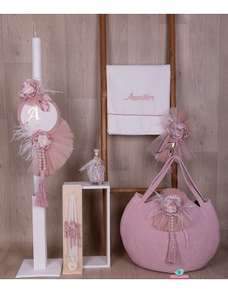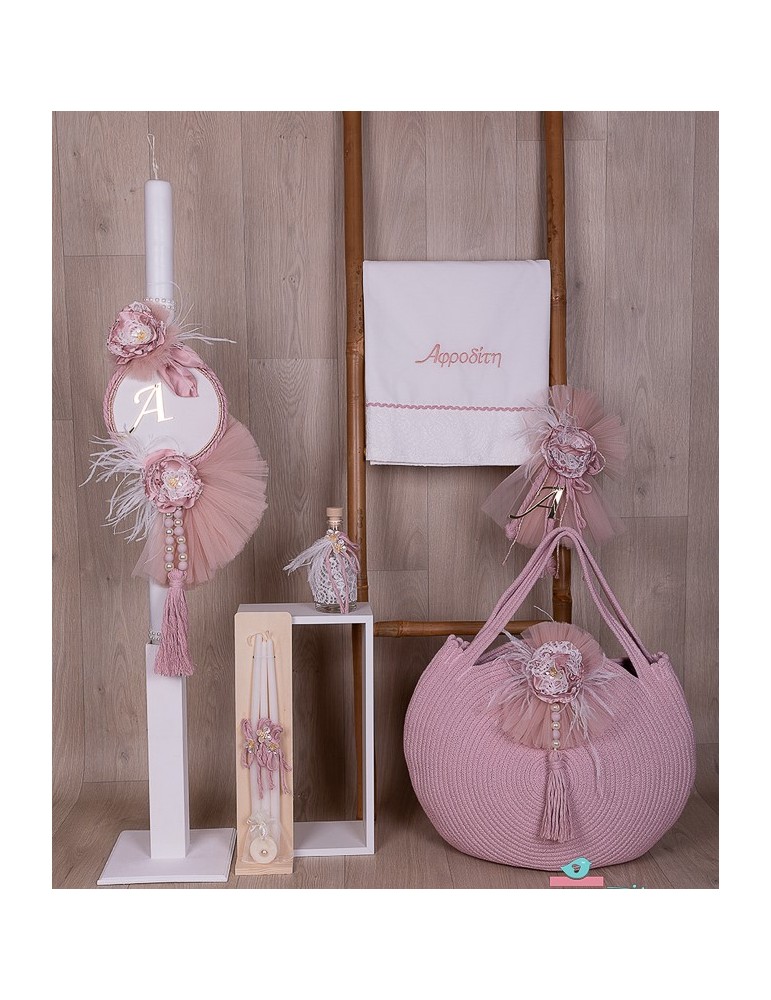Ρομαντικό σετ βάπτισης με λουλούδια και πέρλες, ένα στεφάνι με πέρλες στολίζουν την λαμπάδα και την βαλίτσα συνδυασμένο με λουλούδια και μονόγραμμα. Το σετ περιλαμβάνει λαμπάδα, τσάντα, λαδόπανα και λαδικά.
