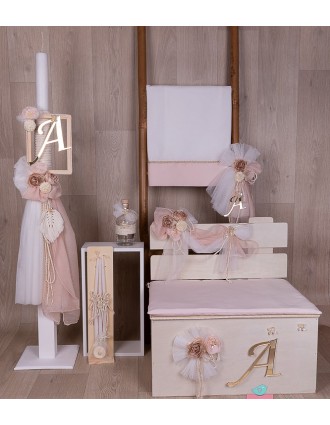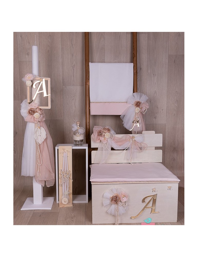 Ρομαντικό σετ βάπτισης ξύλινο παγκάκι στολισμένο με υφάσματα σε αποχρώσεις του εκρού και του σάπιου μήλου με χρυσό μονόγραμμα. Το σετ περιλαμβάνει λαμπάδα, τσάντα, λαδόπανα και λαδικά.