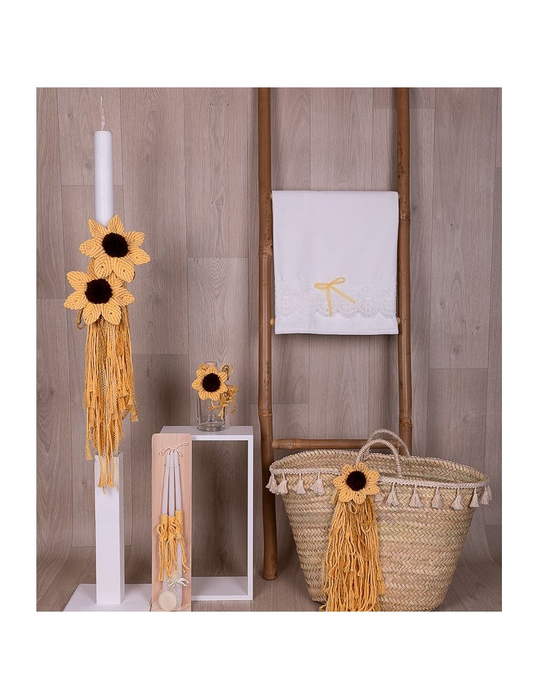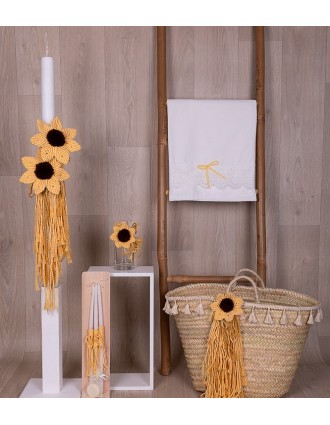 Σετ βάπτισης με χειροποίητους πλεκτούς ηλίανθους, η τσάντα είναι ψάθινη με ηλίανθους.