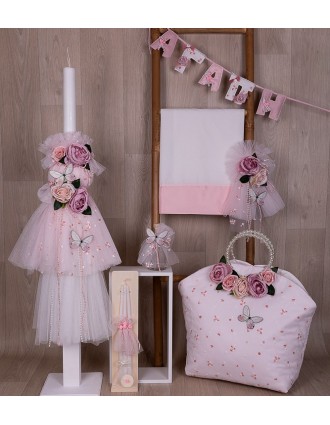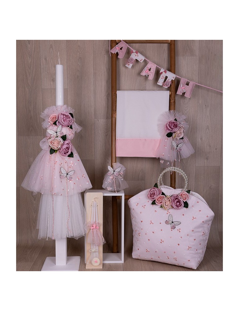 Ρομαντικό σετ βάπτισης με χειροποίητη τσάντα με χεράκι από πέρλες και στολισμένη με λουλούδια και πεταλούδα.