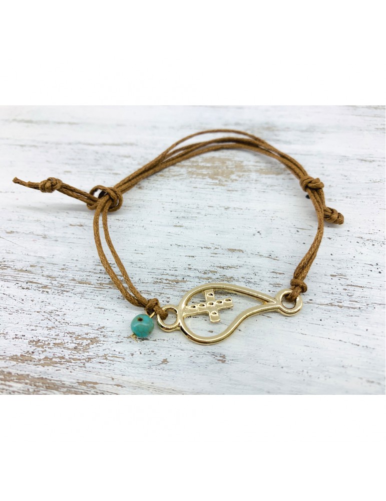 Μαρτυρικό σταυρός σε σταγόνα με ματάκι δεμένο με καφέ κορδόνι.