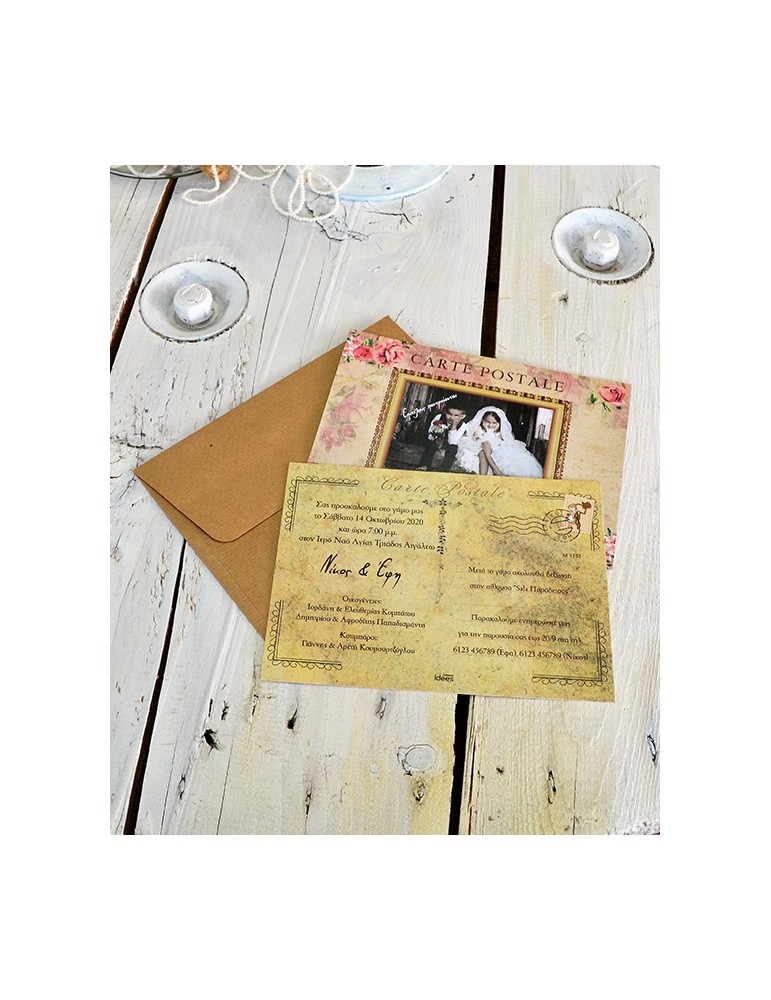 Vintage προσκλητήριο γάμου cart postal. Διαστάσεις: Κάρτα 14 Χ 19 εκ. σε Crush Corn χαρτί στα 250 γρ. Φάκελος 15 Χ 20 εκ. σε Crush Corn χαρτί στα 120γρ. Εκτύπωση κάρτας δείγματος: Απλή, τετραχρωμία.